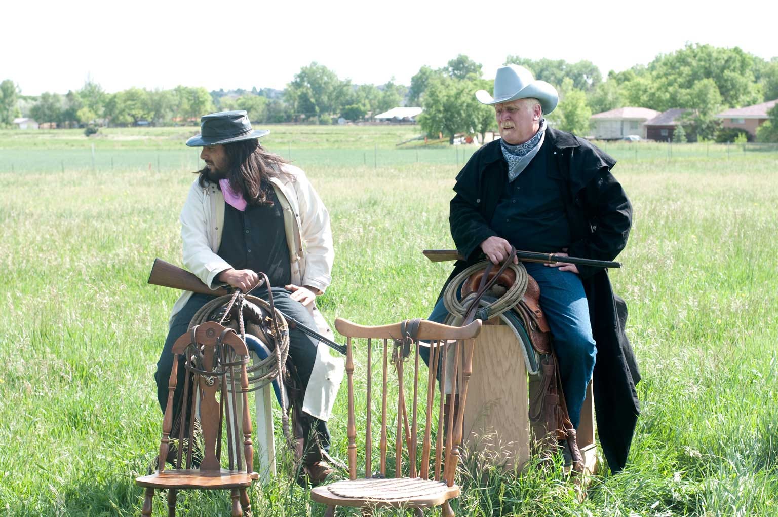 I coached the actors to pantomime driving a large herd, watching for stragglers while swaying back and forth as though mounted on horseback. The high point of the composition I intended as cattle baron’s head, so I positioned my camera accordingly.