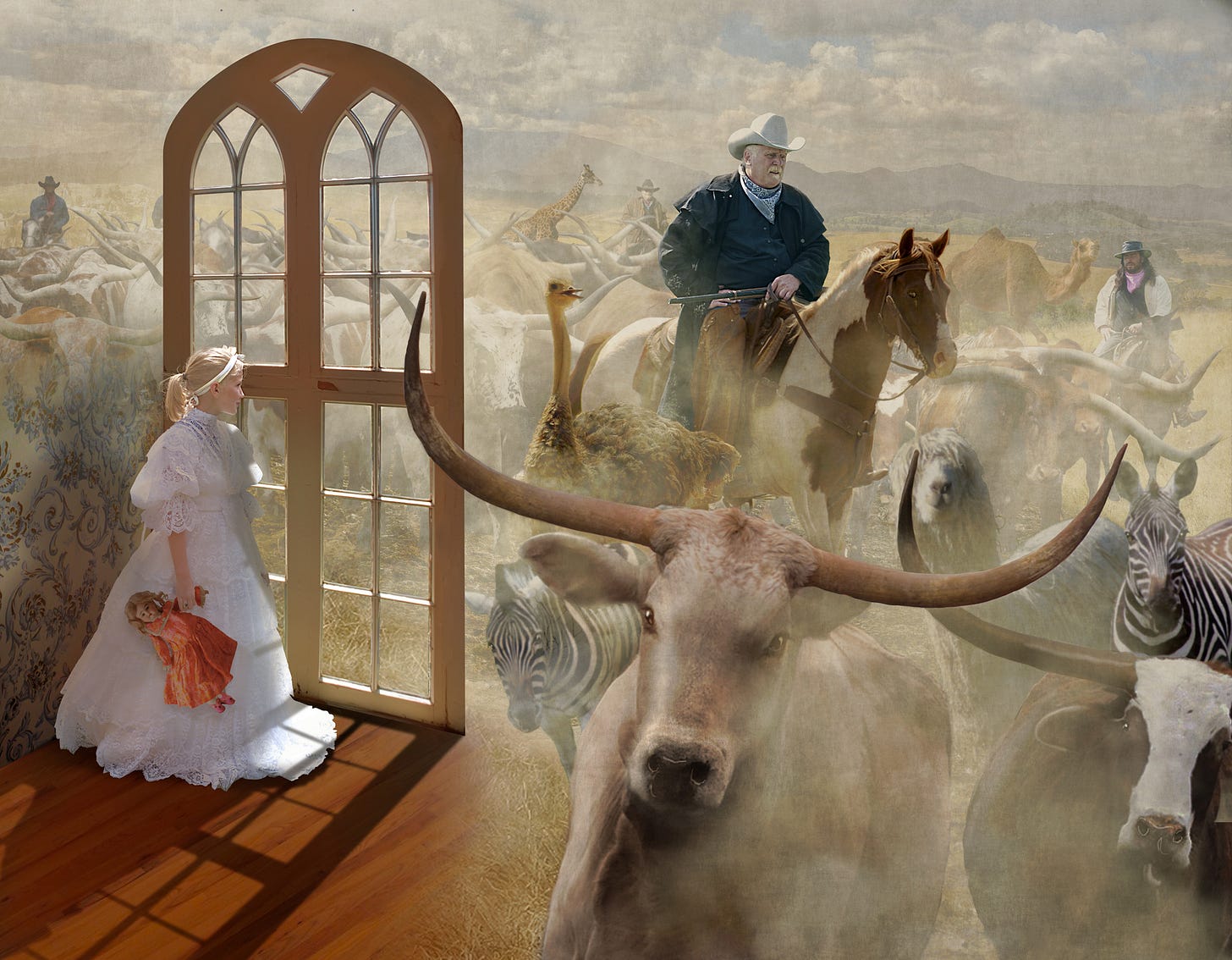 Using a cinematic compositing style, I photographed actors, including a nine-year-old protagonist, the cattle-baron “king,” and his ranch foreman. The child never met the adults in real life, yet each actor had to convey emotionally charged interactions so I could composite all together in the final artwork.