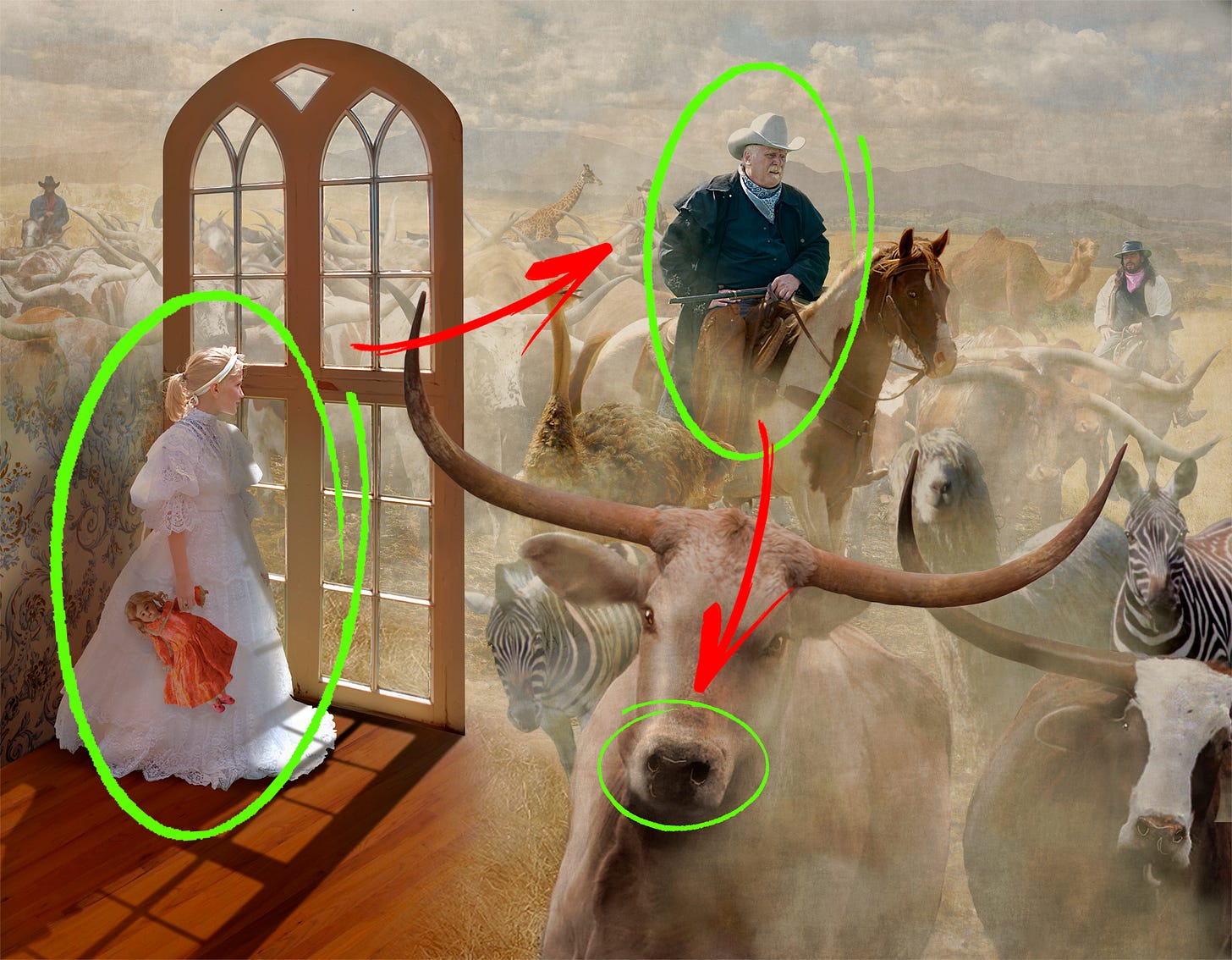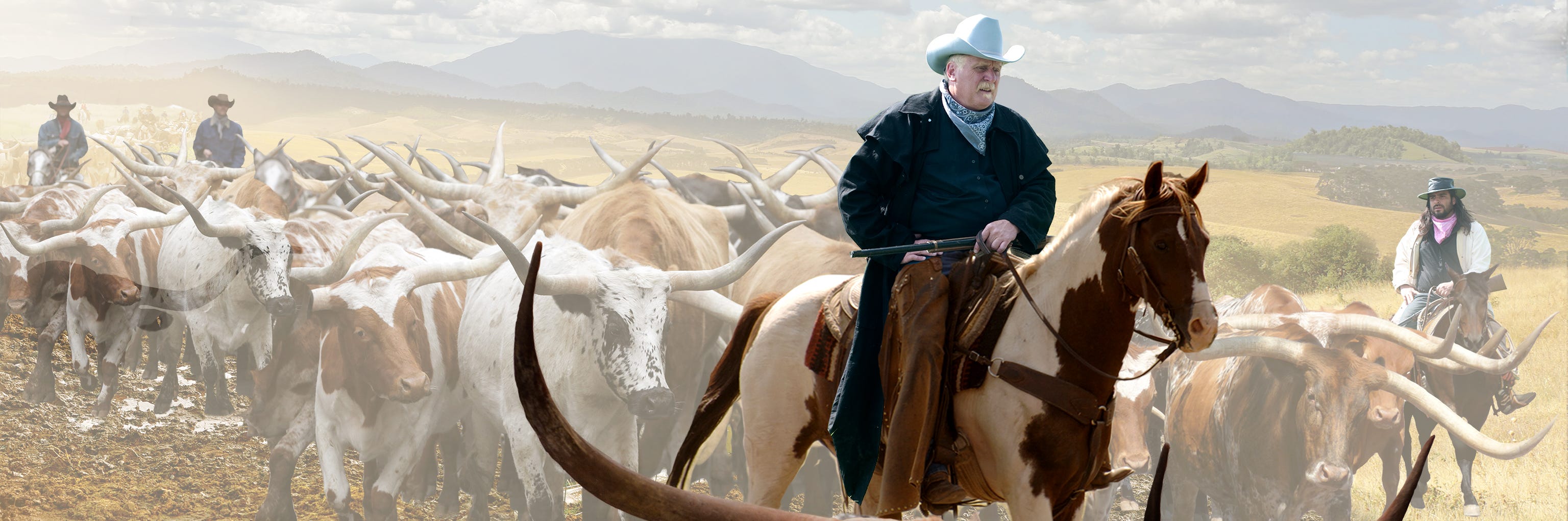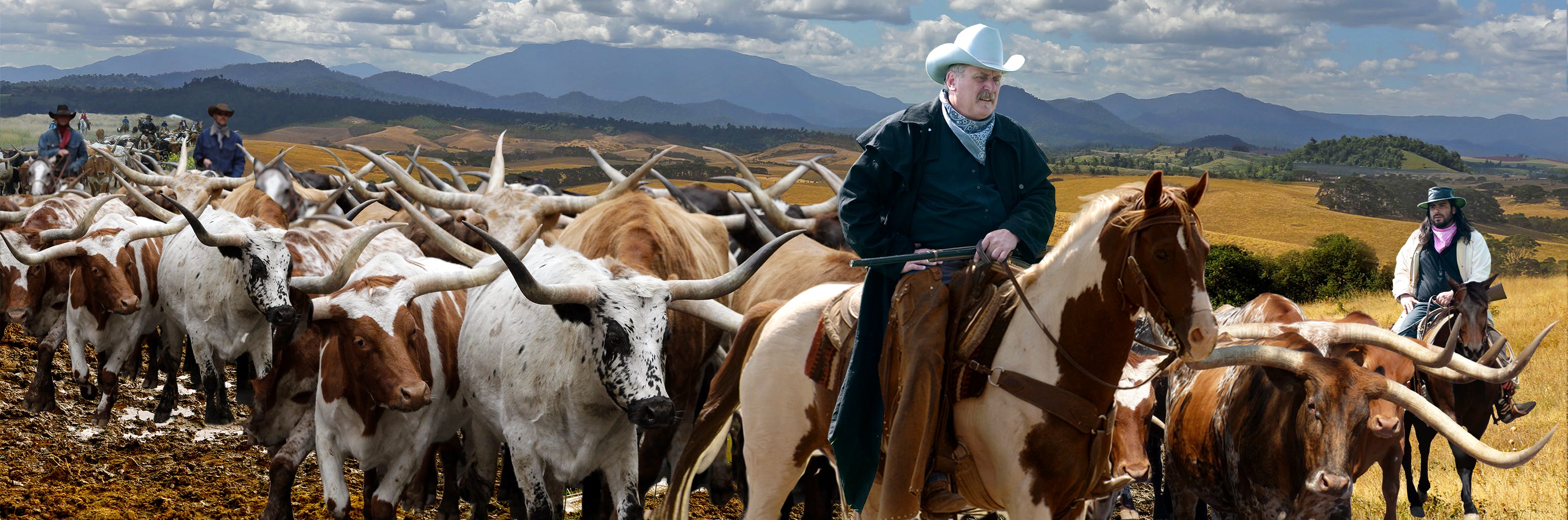 The first step was to cut out the main figures of the cattle baron and his foreman and place them into a Western landscape, keeping the cattle baron/father’s head as the high point—higher than the tallest mountain in the background. Stock imagery of charging longhorns layered into the scene along with two rear wranglers.