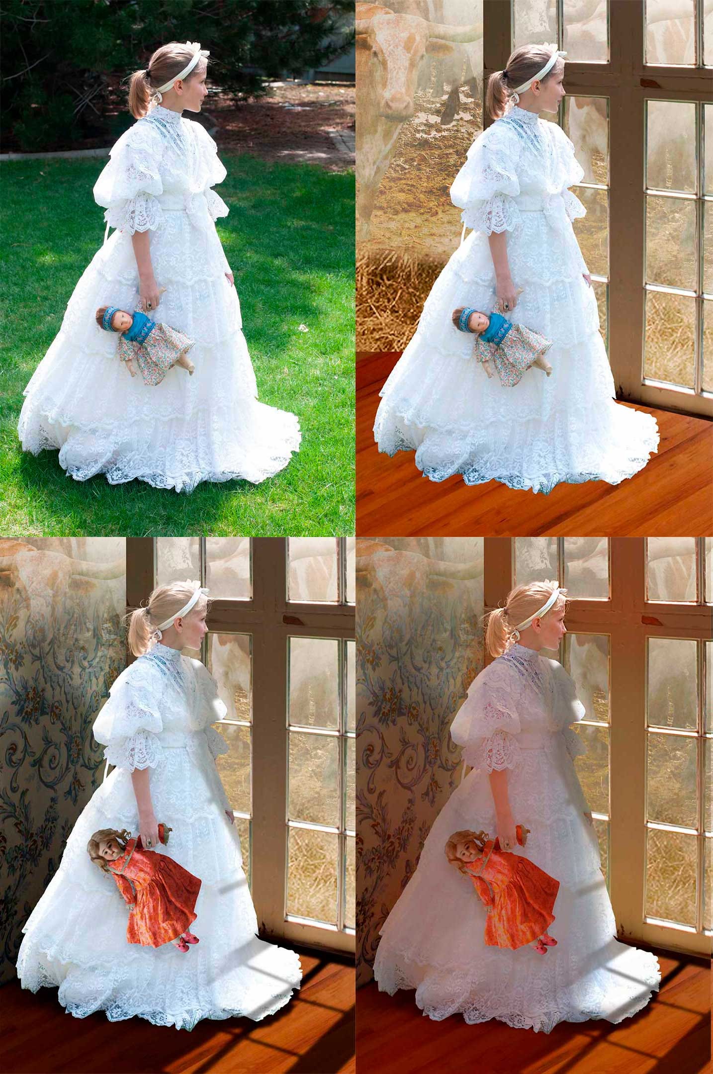 She holds her doll and gazes out as her papa returns from a long cattle drive. I chose a white dress for innocence and purity, with a deliberate bridal reference. The doll dangling from her hand becomes both her imaginary playmate and a body double for acting out her distress as the story advances—hence, the red doll dress.